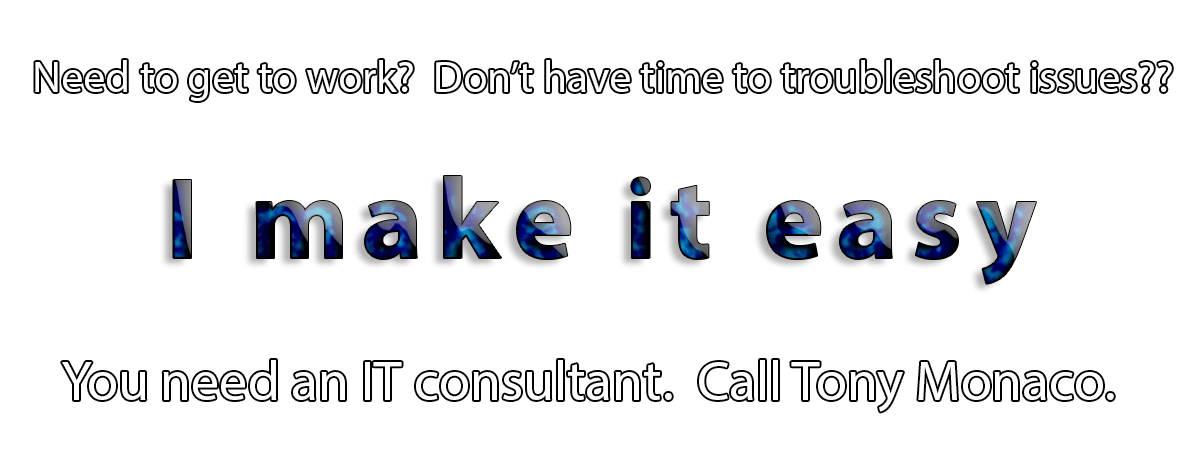 My name is Tony Monaco and I am an MCSE (Microsoft Certified Systems Engineer) certified computer consultant. My small business assists other small businesses with anything related to computers, servers, networks and the Internet. I have been in the business since 1995 and self employed since 2005. My ability to personally manage the needs of my 30+ clients has allowed me to build my business solely from referrals and word of mouth.